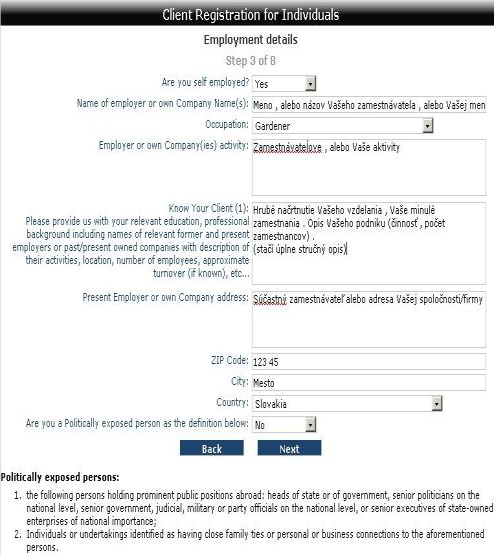 Dostanete se k dotazníku, kde odpovíte na otázku jestli jste nebo nejste zaměstnaný (Are you self employed?) Jestli ano tak vyplňte formulár . A na konci dotazníku je otázka "Are you politically exposed person as the definition below? " - co je v překladu: zda jste nebo nejste politicky zainteresovaná osoba podle definice bodu 1. a 2. kde :